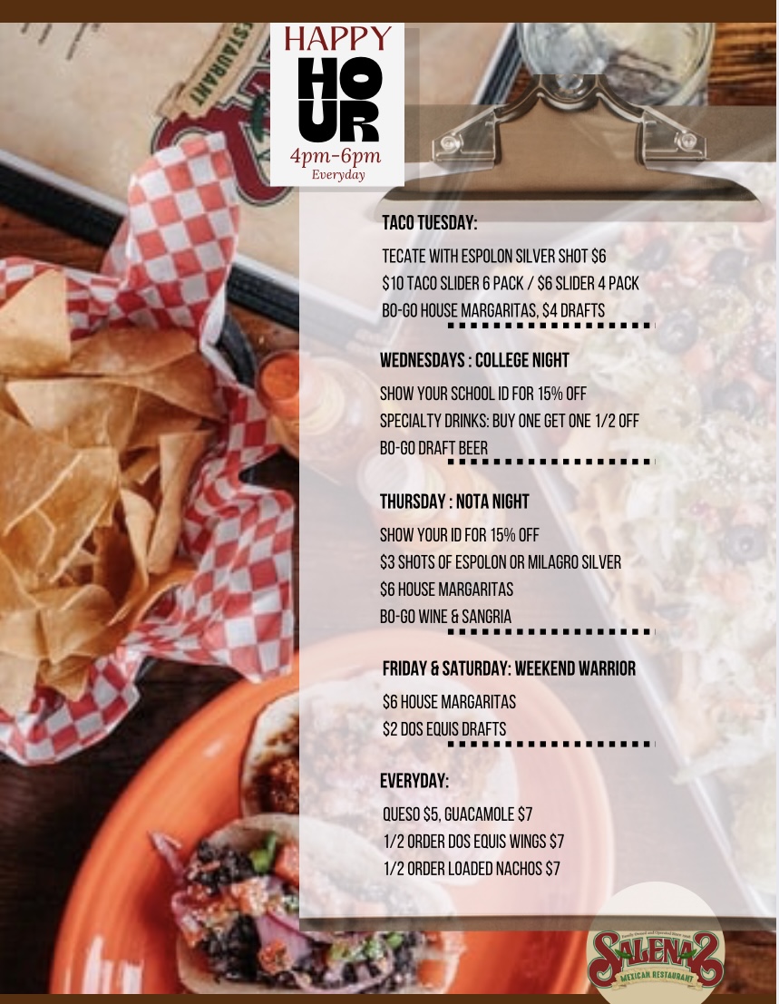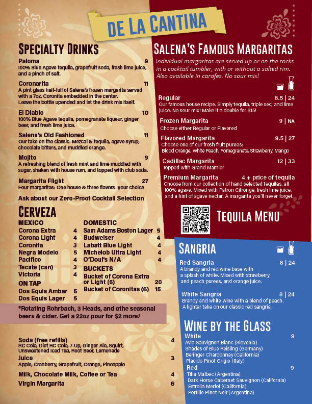 Whether it’s Happy Hour with friends or a night of tequila tasting, Salena’s Mexican Restaurant is your go-to bar in the Neighborhood of the Arts.